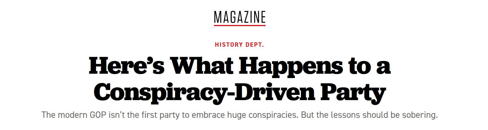 “現代共和黨不是第一個擁抱大型陰謀論的黨,但是歷史教訓應該讓他們清醒。”在特朗普2021年看似身敗名裂的時候,這話聽起來好像有點道理,但我們現在都知道這劇情後來是怎麼發展的了。