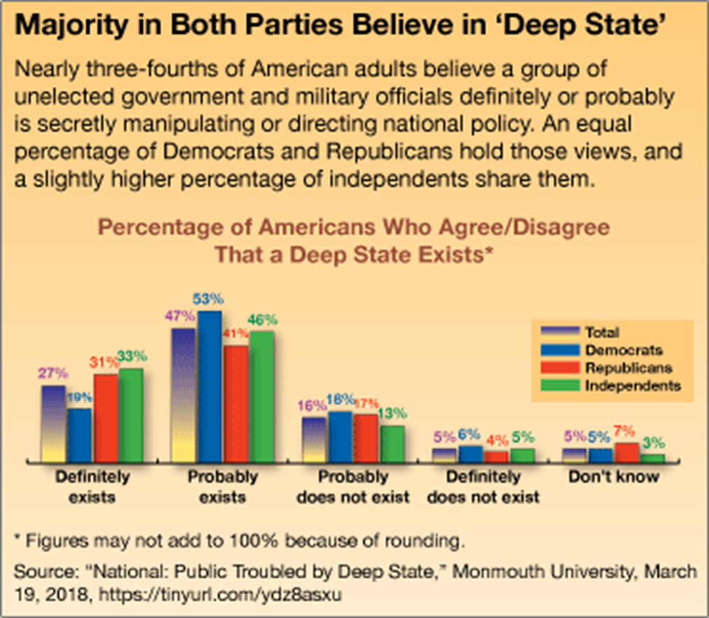 特別是關於政府被邪惡精英綁架的“深層政府”式的陰謀論,從美國建國至今就不斷演變,並且不斷有主流政客利用和傳播這種陰謀論。