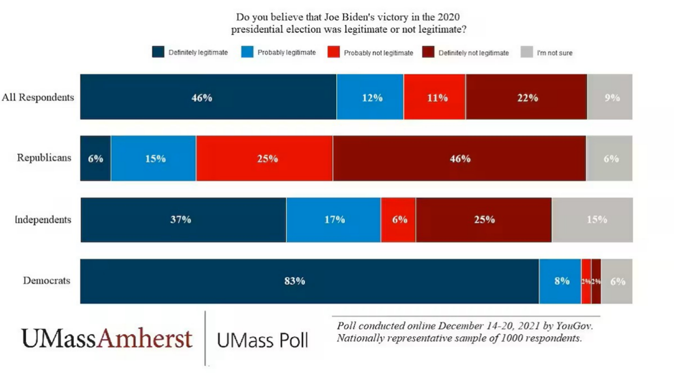 而在2020年大選上,民主黨一邊倒地認為拜登的勝利無可置疑,共和黨則一邊倒地認為拜登勝之不武不是合法的總統: