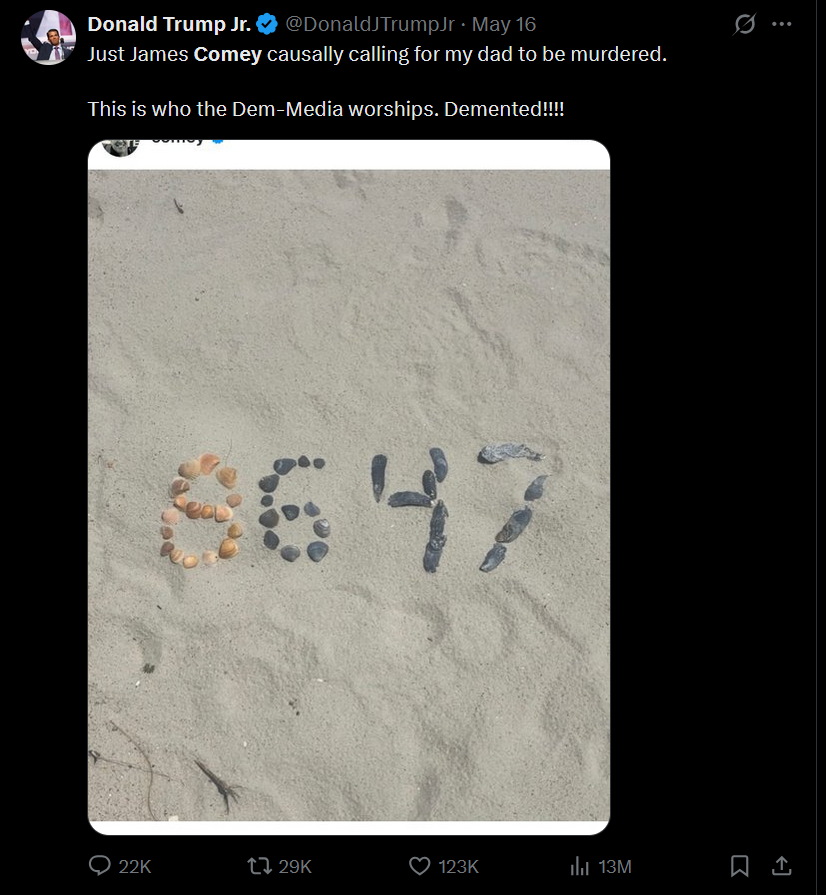 比如上個月前FBI局長科米在社交媒體上隨手發了個圖,圖上是排成數字“8647”的貝殼,特朗普的兒子馬上跳出來指控科米是在暗中呼籲人們刺殺特朗普: