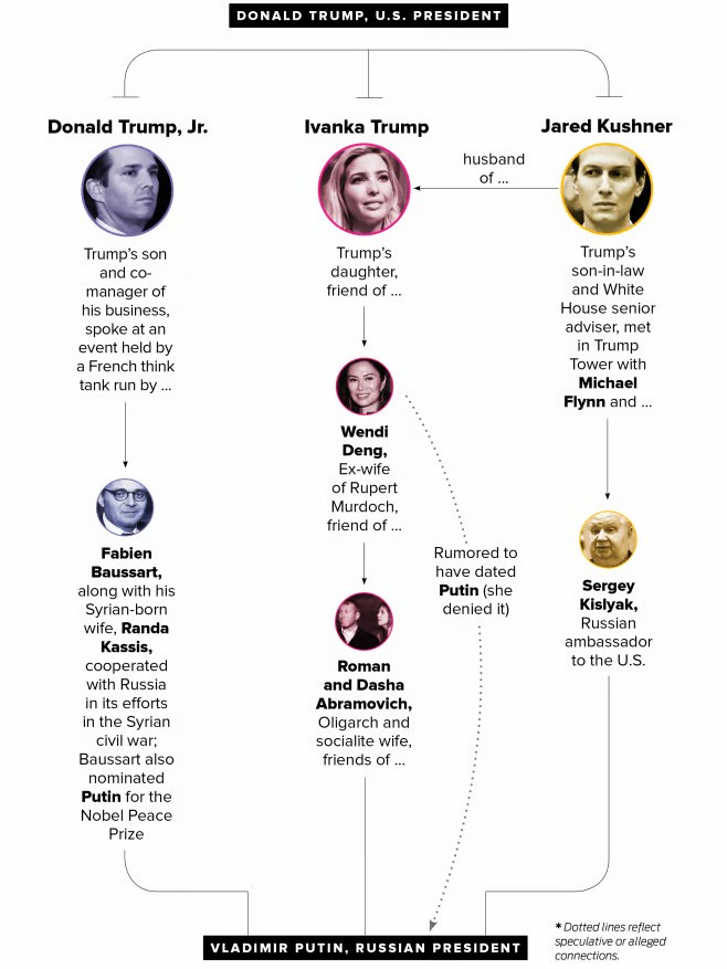比如著名主流媒體politico當時做了一系列圖表來描繪特朗普和普京的關係,然而這些圖裏的內容都禁不起推敲。如下面這張圖寫的是特朗普的家人如何跟普京有聯繫: