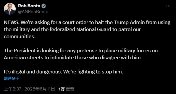 10日早些時候,加州總檢察長邦塔在社交媒體X平台發文表示,加州政府已經請求法院下令阻止特朗普政府使用軍隊和聯邦國民警衞隊巡邏加州社區。他寫道:“總統正在尋找任何藉口在美國街頭部署軍隊來恐嚇那些不同意他的觀點的人。這是違法且危險的。我們正在努力阻止他。”