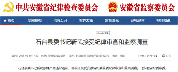 據安徽紀檢監察網6月10日消息,石台縣委書記靳武涉嫌嚴重違紀違法,目前正接受安徽省紀委監委紀律審查和監察調查。