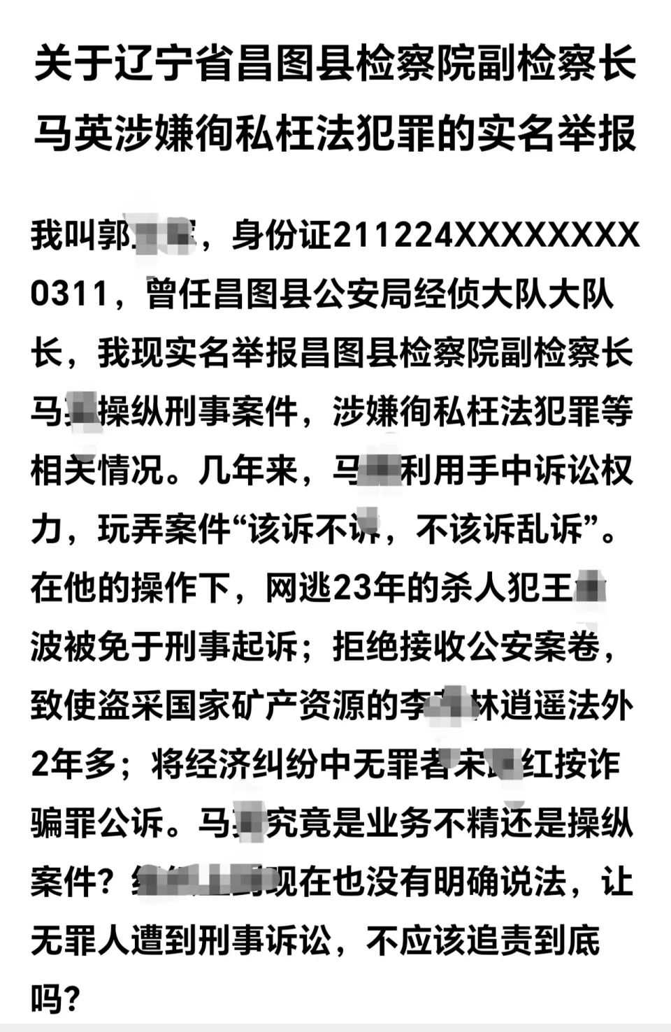 遼寧昌圖縣一退休民警實名舉報原副檢察長,指控其徇私枉法