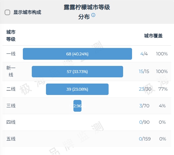 有數據顯示,lululemon在北上廣深四座城市的門店貢獻佔其在中國市場75%左右的營收。但根據極海品牌監測的數據口徑,lululemon在一線城市的門店比例僅在40%左右(截至6月10日)。