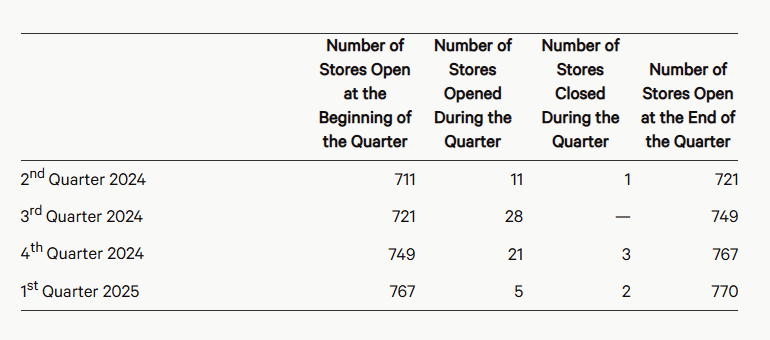 從門店數量上看,lululemon在上季度淨新增3家直營門店(開店5家,關店2家),截至季度末門店總數達770家。去年年底,lululemon曾表示2025年計劃全球新開門店40-45家,結合以往季度門店開業數對比可以看出lululemon的開店節奏也開始放緩。