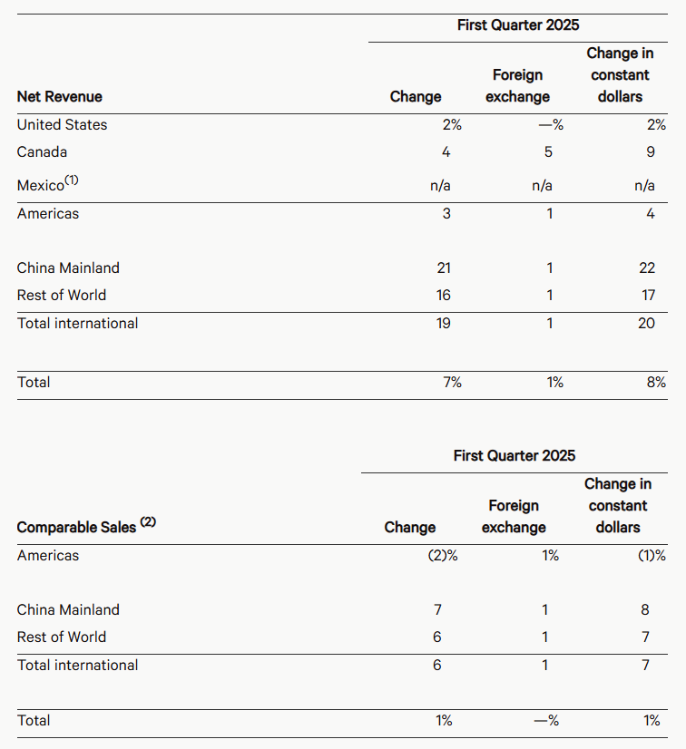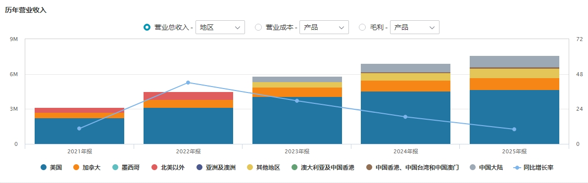 按區域業務來看,美洲地區淨營收增長3%(不變匯率計算增長4%);國際市場淨營收增長19%(按不變匯率計算增長20%)。較2024財年不變匯率計算下美洲地區增長的8%和中國地區的48%進一步萎縮,不僅北美市場增長觸底,中國市場的增長也在放緩。