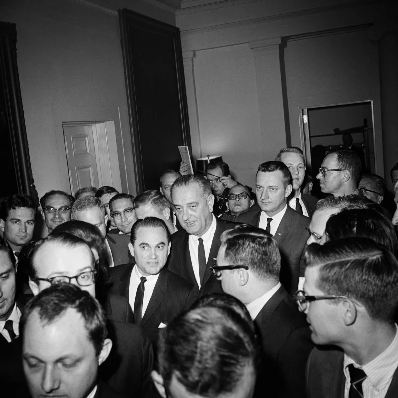 1965年3月13日:時任美國總統總統林登·約翰遜(中)和阿拉巴馬州州長喬治·華萊士(左二)在白宮會面討論阿拉巴馬州塞爾瑪的事件。 法新社