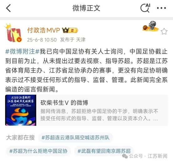 另據體育媒體人付政浩的微博,他也詢問了中國足協有關人士,對方也表示:截止到目前為止,從未提出過要去視察、指導蘇超。“蘇超”是江蘇省體育局主辦、江蘇省足協承辦的賽事,更沒有向足協明確表示過不接受任何形式的指導、監督、管理。