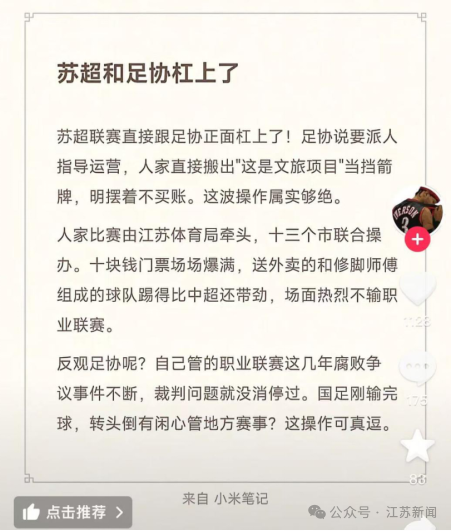 近期,網上有人發帖稱:“蘇超”直接跟中國足協正面槓上了!足協説要派人指導運營,江蘇足協直接搬出“這是文旅項目”當擋箭牌,明擺着不買賬。