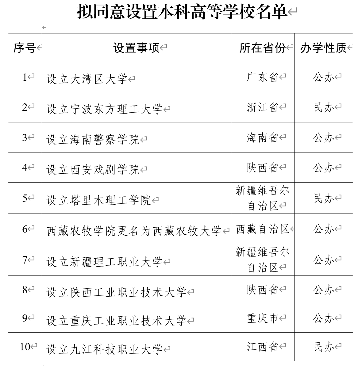 6月11日,教育部網站消息,根據《中華人民共和國高等教育法》《普通高等學校設置暫行條例》《普通本科學校設置暫行規定》《本科層次職業學校設置標準(試行)》等有關規定以及第八屆全國高等學校設置評議委員會考察評議結果,經教育部黨組會議審議,擬同意設置大灣區大學等10所學校,現予公示。