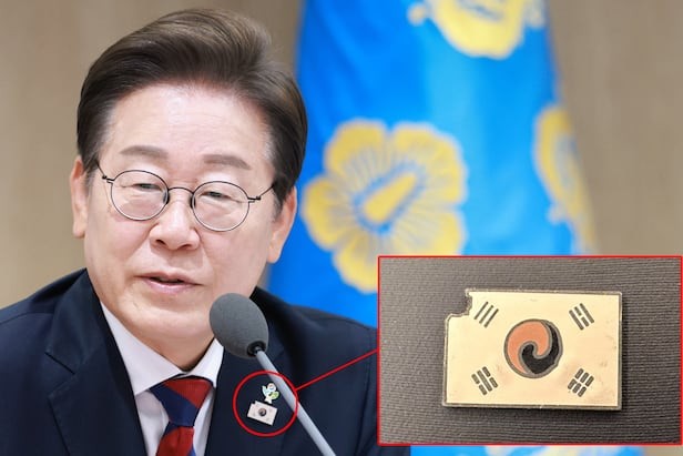 李在明上任後,5日主持第一次內閣會議、出席在首爾洞雀區首爾國家紀念館舉行的“顯忠日”紀念儀式時,都佩戴了這枚徽章。徽章與一般的韓國國旗形狀不同,左上角有一部分被撕裂。除此之外,太極圖案以及四角四卦的排列,都與普通的太極旗不同。