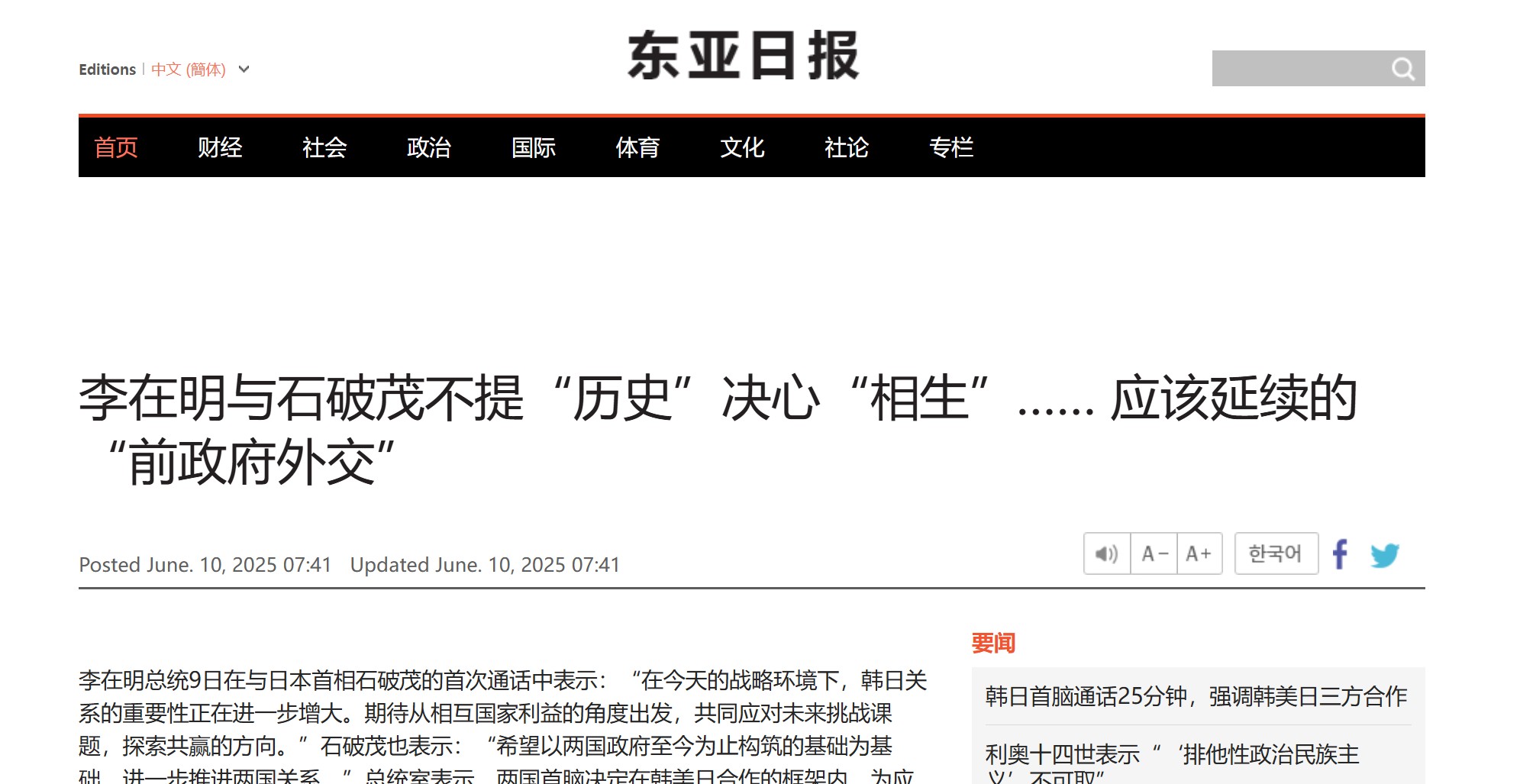 韓國“保守三報”之一的東亞日報,對尹錫悦“果斷修改對日政策”頗為懷念,並稱李在明與石破茂的電話沒有提及歷史問題較為明智。