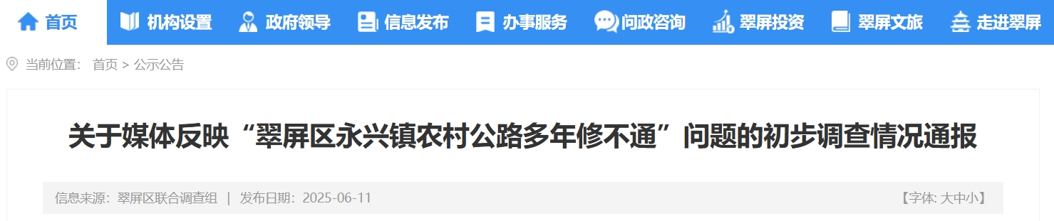 通報稱,6月10日,有媒體反映翠屏區永興鎮一農村公路多年修不通的問題,引發社會關注。區委、區政府高度重視,成立由區政府辦牽頭,區紀委監委、區交通運輸局、區農業農村局、永興鎮政府等相關部門(單位)組成的聯合調查組,堅持實事求是原則,立即開展全面調查核實。現將初步調查情況通報如下。