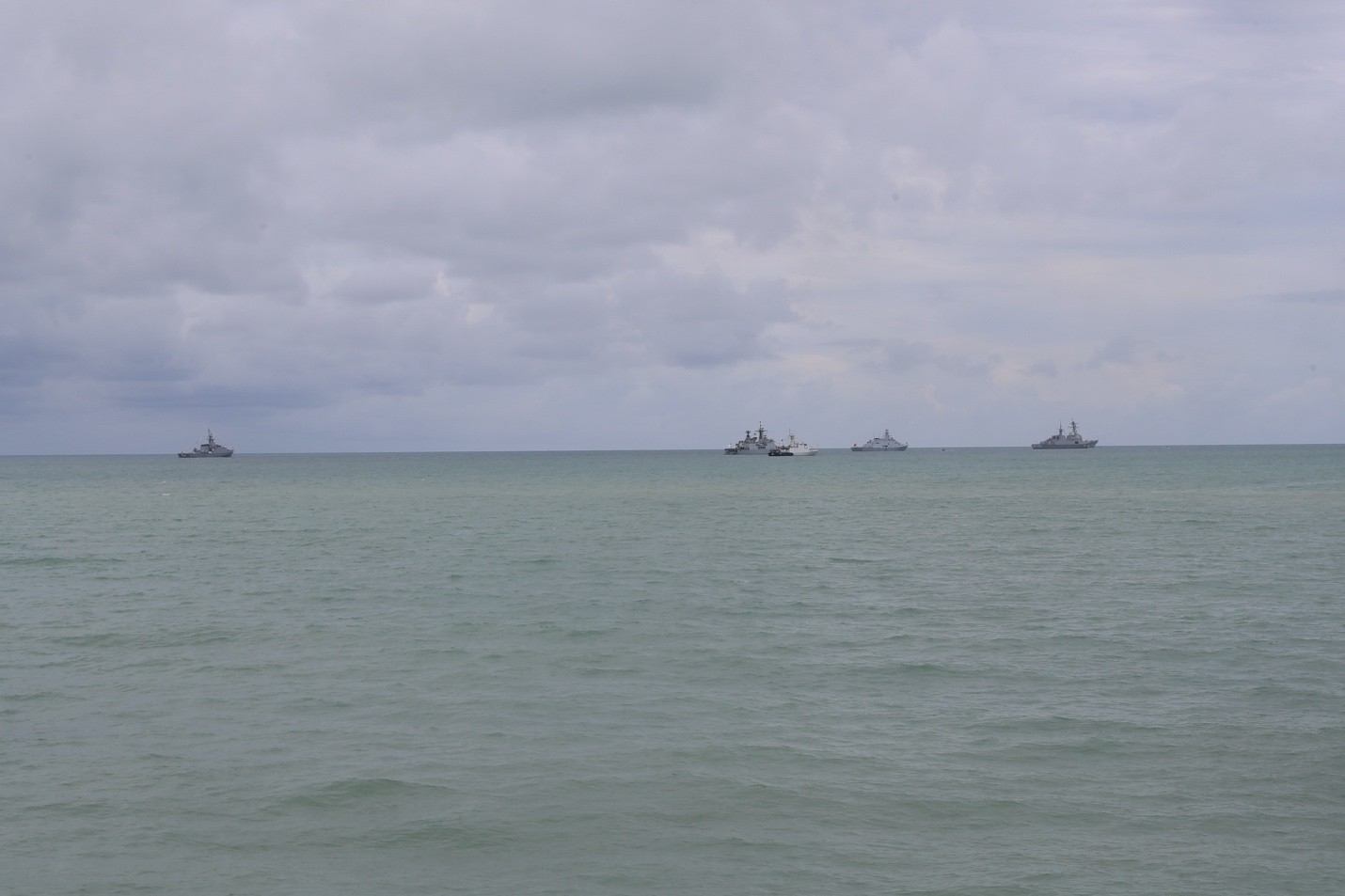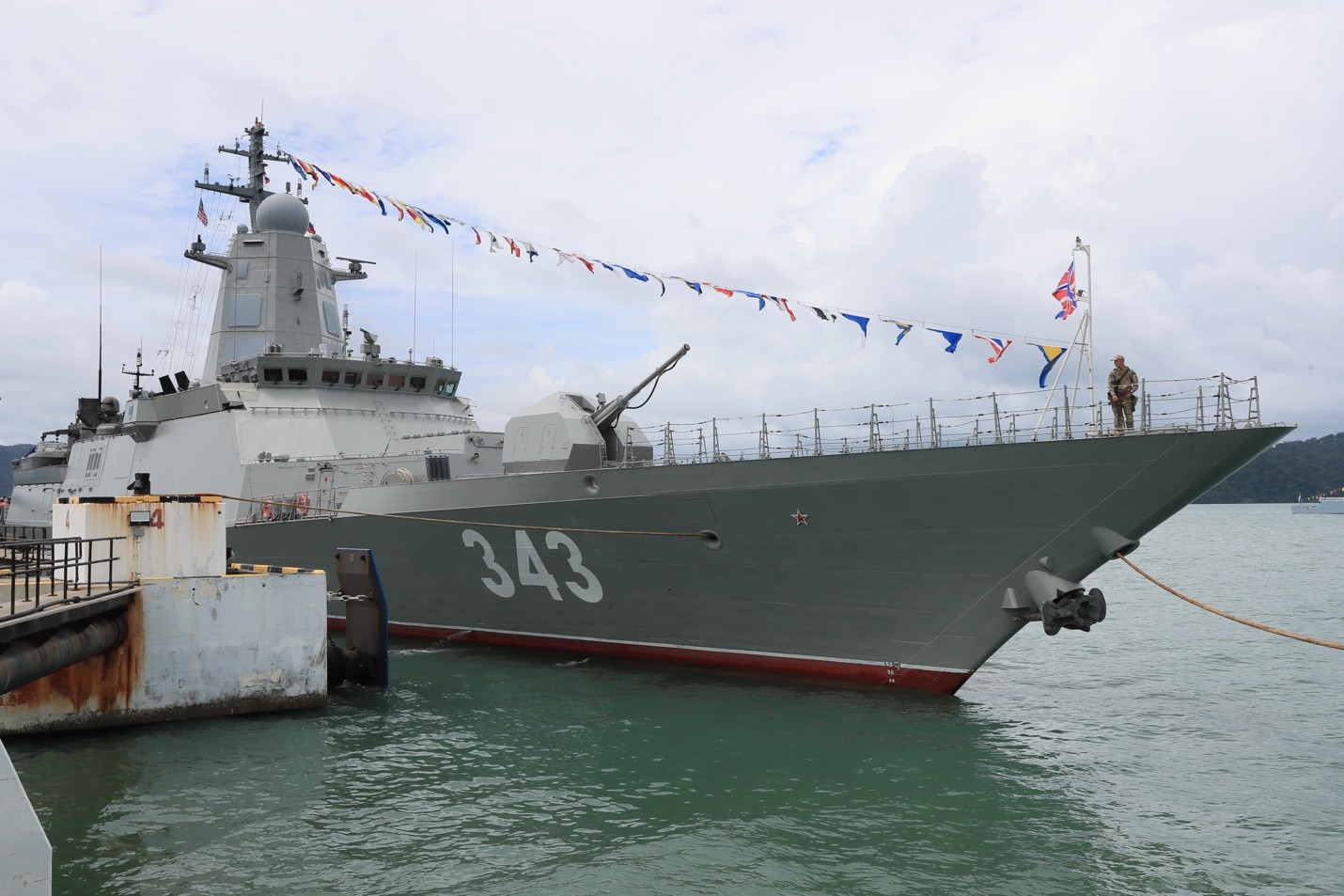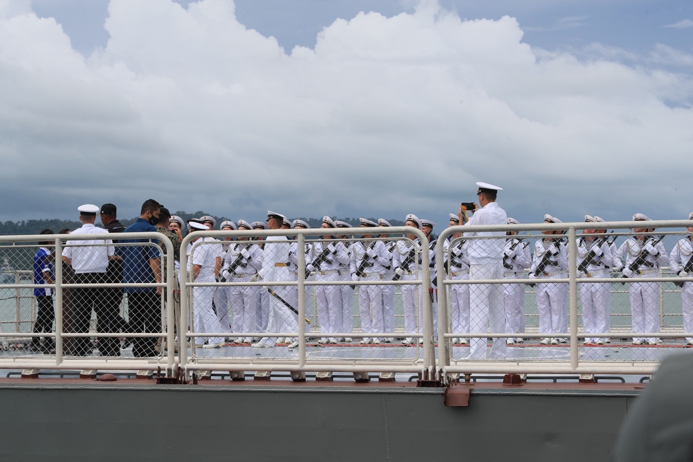 俄羅斯水兵們昂首挺胸列隊在後甲板上,等待檢閲。不時有高官模樣的VIP登艦,其中一人看樣子是馬來西亞總參謀長一類的人物。在銅管奏樂中,水兵齊唱俄羅斯國歌,然後一個俄羅斯海軍將軍(可能是編隊司令)陪同檢閲,另一個軍官持劍隨後護衞,派頭挺足的。檢閲完畢再講一通沒營養的廢話。