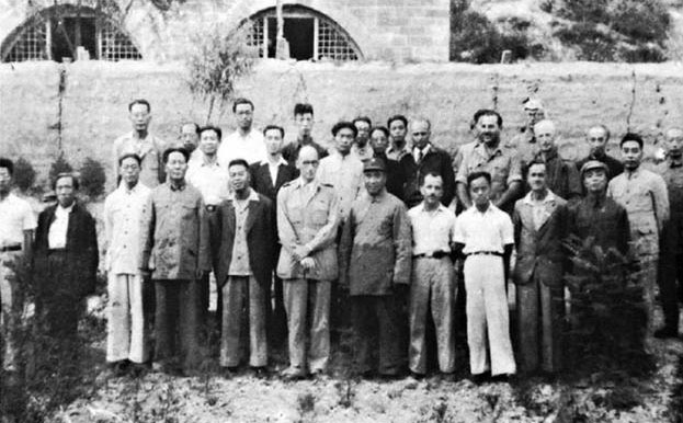 毛澤東、朱德與中外記者西北參觀團在王家坪合影