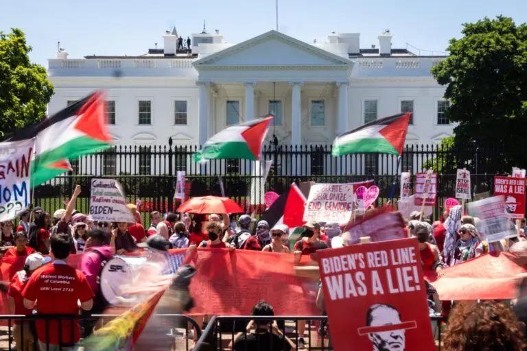 2024年6月8日,數千名親巴勒斯坦抗議者當天聚集在白宮周圍,敦促拜登停止對以色列的一切軍事援助,並呼籲以色列立即停止在加沙的戰爭行為。視頻截圖