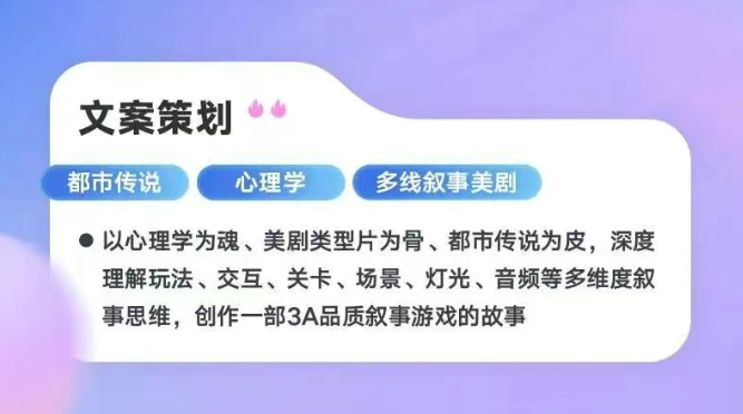 內容方面,在文案策劃崗要求應聘人員需要“以心理學為魂、美劇類型片為骨、都市傳説為皮”,並在理解遊戲玩法等前提上,創作3A品質敍事遊戲的故事。這種典型的美劇多線交織敍事類劇情可以參考單機遊戲《底特律:化身為人》,而都市傳説類限定較大,以心理學作為突破口,也可以讓劇情更有深度。