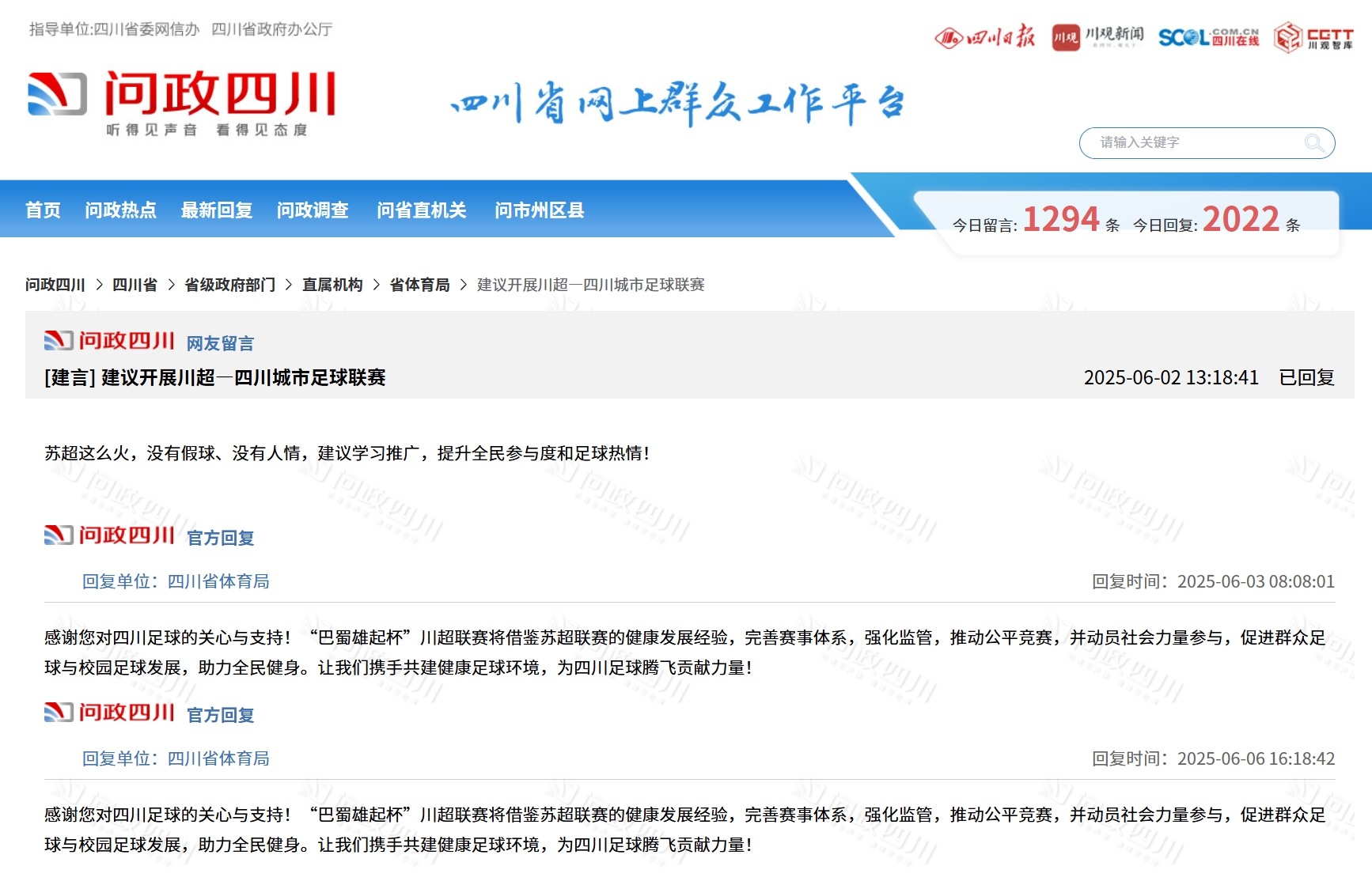四川省體育局6月6日回覆:“感謝您對四川足球的關心與支持!‘巴蜀雄起杯’川超聯賽將借鑑蘇超聯賽的健康發展經驗,完善賽事體系,強化監管,推動公平競賽,並動員社會力量參與,促進羣眾足球與校園足球發展,助力全民健身。讓我們攜手共建健康足球環境,為四川足球騰飛貢獻力量!”
