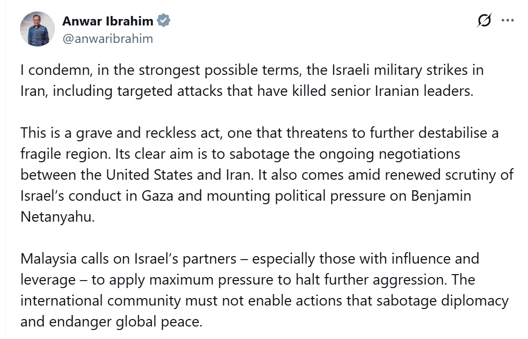 馬來西亞總理易卜拉欣則表示,他以“最強烈的措辭譴責以色列對伊朗的軍事打擊,包括其對伊朗高級領導人的有針對性的襲擊。”易卜拉欣批評道,“這是一次嚴重且魯莽的行徑,有可能進一步破壞這個脆弱地區的穩定。其明顯目的是破壞美國與伊朗之間正在進行的核談判。與此同時,以色列在加沙的行為將受到重新審視,內塔尼亞胡也面臨越來越大的政治壓力。”