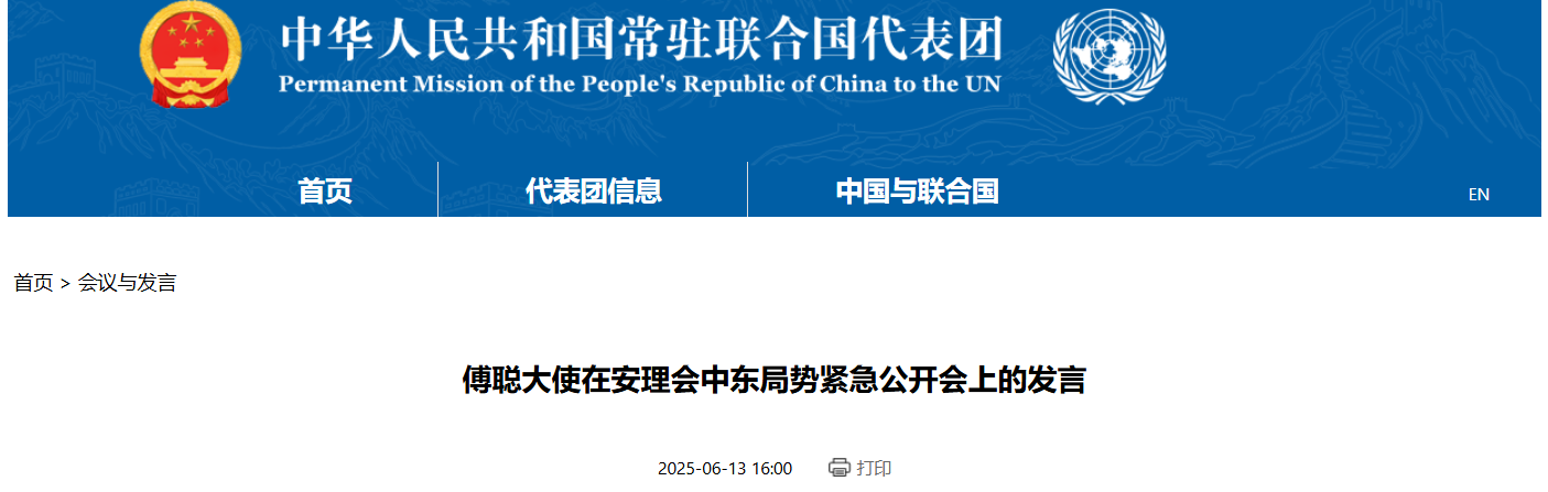 據中國常駐聯合國代表團網站消息,6月13日,中國常駐聯合國代表傅聰在安理會中東局勢緊急公開會上發言,表示中方譴責以色列侵犯伊朗主權、安全和領土完整的行為。