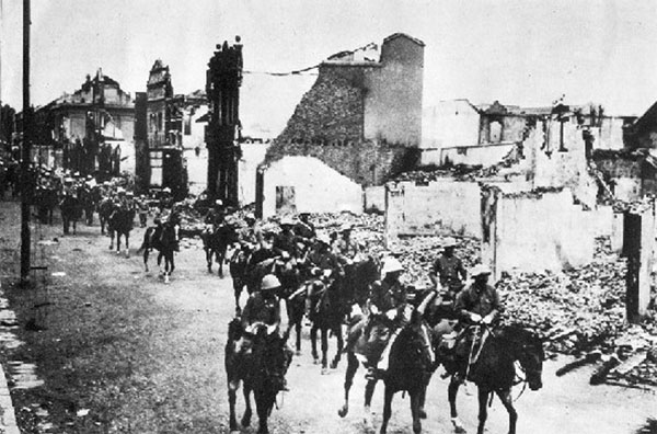 侵入宜昌的日軍行進在殘垣斷壁的街頭,攝於6月12日
