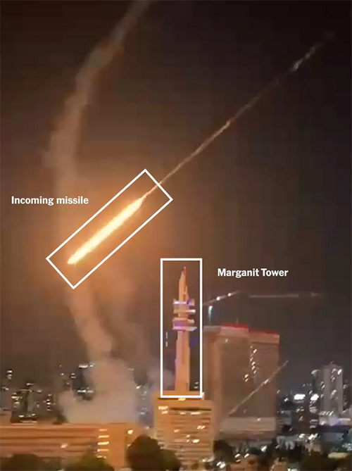 視頻顯示,至少有一枚來自伊朗的導彈成功命中了以色列境內一個重要指揮點,畫面中明顯可以看到基里亞區的瑪加尼特塔樓,這座地標建築毗鄰以色列國防軍總部,成為本次襲擊的關鍵目標之一。