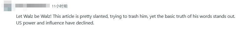 有網民評論稱:“這篇文章相當傾斜,試圖抨擊他,但他言論中的基本事實顯而易見。美國的實力和影響力已經衰落。”也有人表示:“他是對的,沒有人再指望美國發揮全球領導作用了。他們為什麼會呢?那些日子已經一去不復返了。”