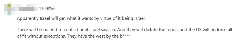 還有人指出,美國在中東地區的衝突中過於偏袒以色列,“顯然,以色列能得到它想要的,因為它是以色列。在以色列説出來之前,衝突不會結束,他們將決定條款,而美國將毫無例外地支持所有條件。”