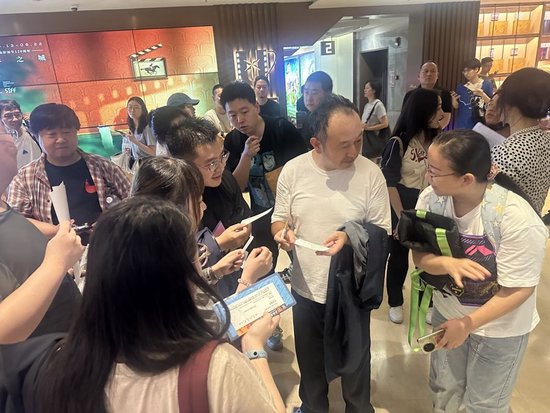 20時00分,在電影《旅途愉快》觀眾見面會散場時分,趕到了UME影城新天地店,發現導演足立紳正被熱情的影迷團團圍住,他們帶來特製的新片海報找他簽名,他們還有很多剛才見面會來不及提的問題要追問導演。導演也被熱情感染,甚至脱掉了外衣,額頭和後頸都冒着汗,但他沒有丁點要“逃離”現場的意思,正愉快地與影迷交流,享受這段短暫的旅途。“我4月份在日本見過導演和他夫人,這次上影節,知道導演要帶着新片來,還有見面會,立馬搶票,第一排。”影迷袁小姐語氣裏有幾分激動,“你看,前面見面會我就拍了好多照片,今天提問都非常犀利,還有人問結局的處理,是不是因為導演不夠自信,真刀真槍真交流,上影節真的太棒了。”