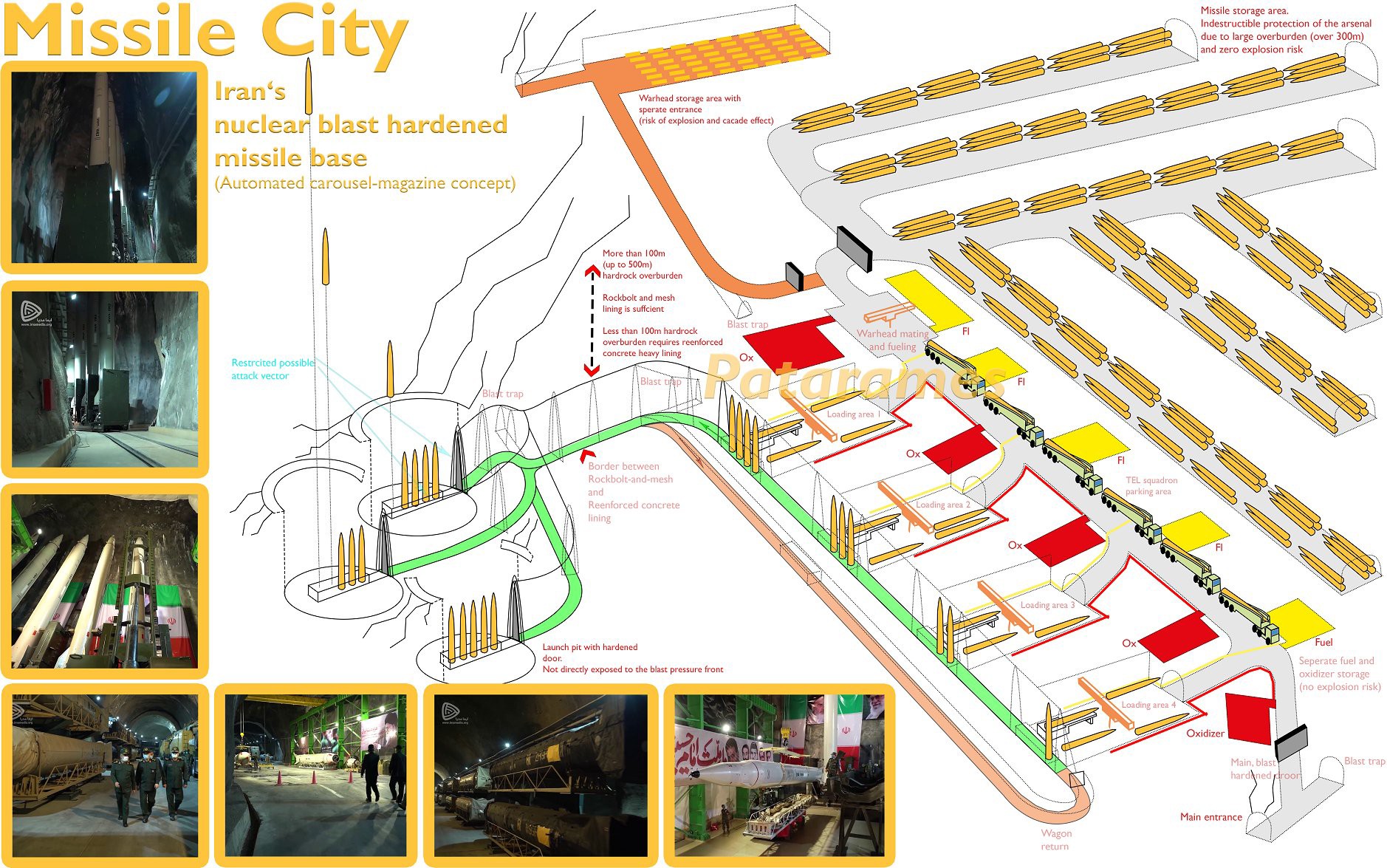 伊朗共有三種中導掩體類型。圖1是最常見的一種,擁有預製開口和彈藥儲存庫。這種發射井一般都是兼容固體彈和液體彈發射的(固體彈放在傳送帶裏),由於液體彈需要進到井內起豎加註(圖4)固上方開口較大,加之伊朗施工作業能力不強,沒有裝配足夠強度的發射蓋,而且不少直接開口裸奔,導致這種開口很容易被炸垮塌,伊朗很可能短時間內無法破障,導致反擊不及時。