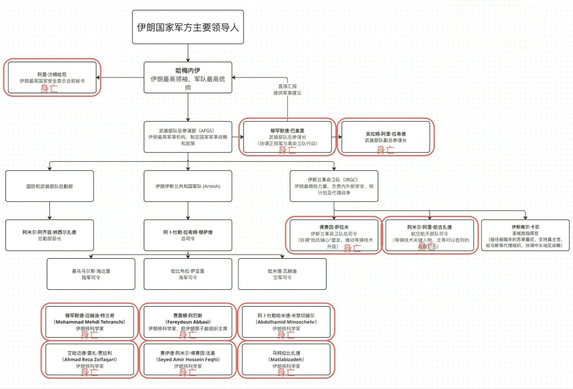 在此次行動中,以色列幾乎斬首了伊朗革命衞隊體系中的全部領導層。哈梅內伊住所疑似也遭到襲擊,可見摩薩德/CIA對伊朗滲透程度之深(革命衞隊領導層都被炸死了,那到底是誰泄露的革命衞隊高層信息?難道是哈梅內伊嗎?)