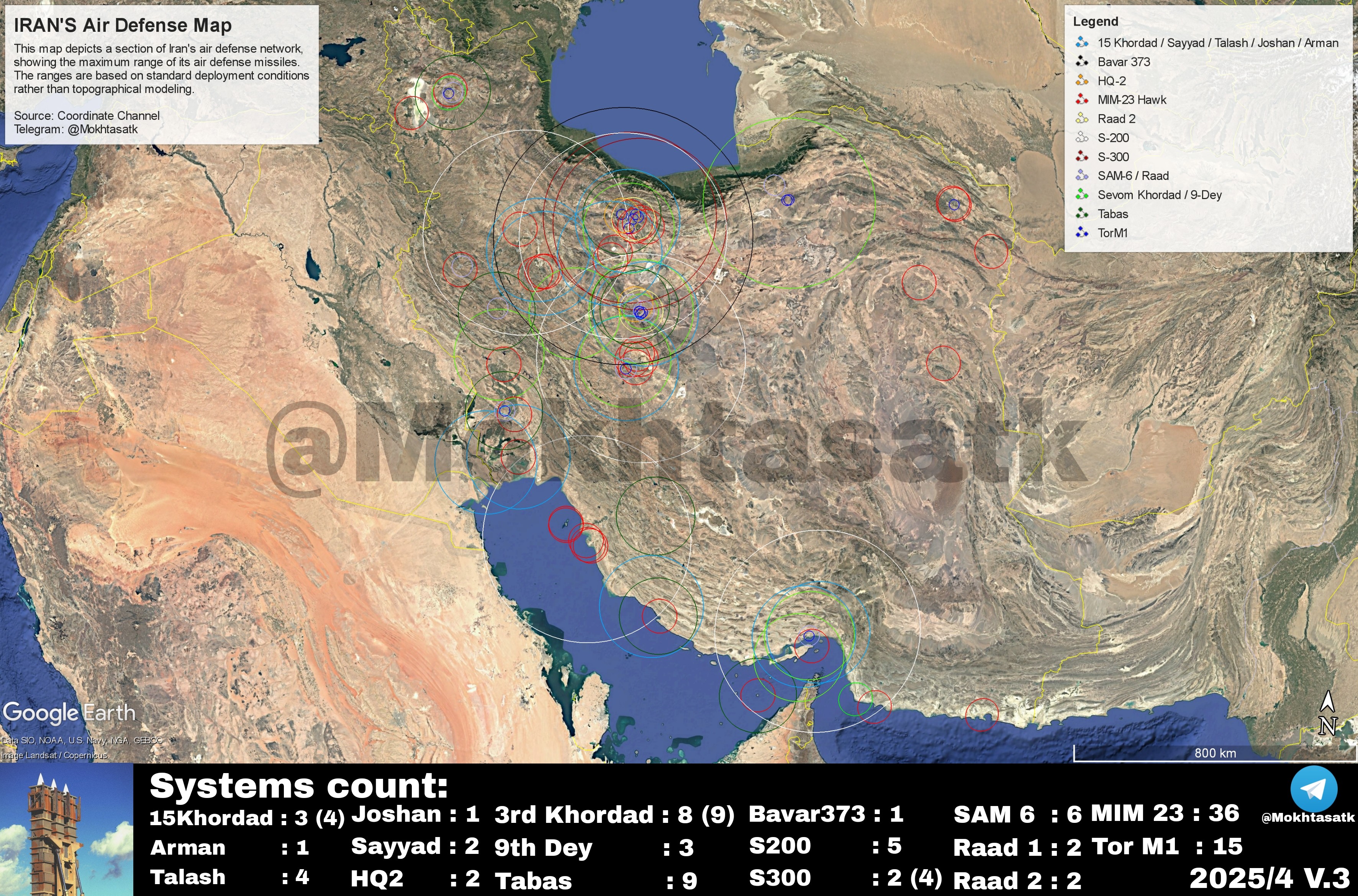 考慮到伊朗大部分關鍵設施位於德黑蘭與伊斯法罕,伊朗防空武器的佈置也集中於此,下圖為外國osinter製作的2025年4月伊朗防空武器位置圖。