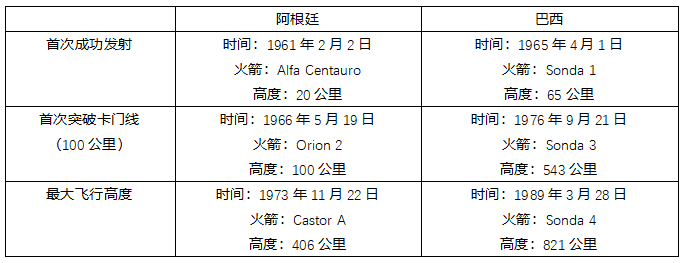 1957年,蘇聯發射第一顆人造衞星,拉美國家也掀起了一波火箭熱。阿根廷在1960年建立了國家空間研究委員會(CNIE)。巴西於1961年成立了空間活動國家委員會組織集團(GOCNAE)。兩國都把探空火箭作為發展重點,並在此後數十年裏展開了一場你追我趕的區域太空競賽。拉美兩大航天強國的地位從此建立,一直持續至今。下表是兩國早期探空火箭發展的主要里程碑。