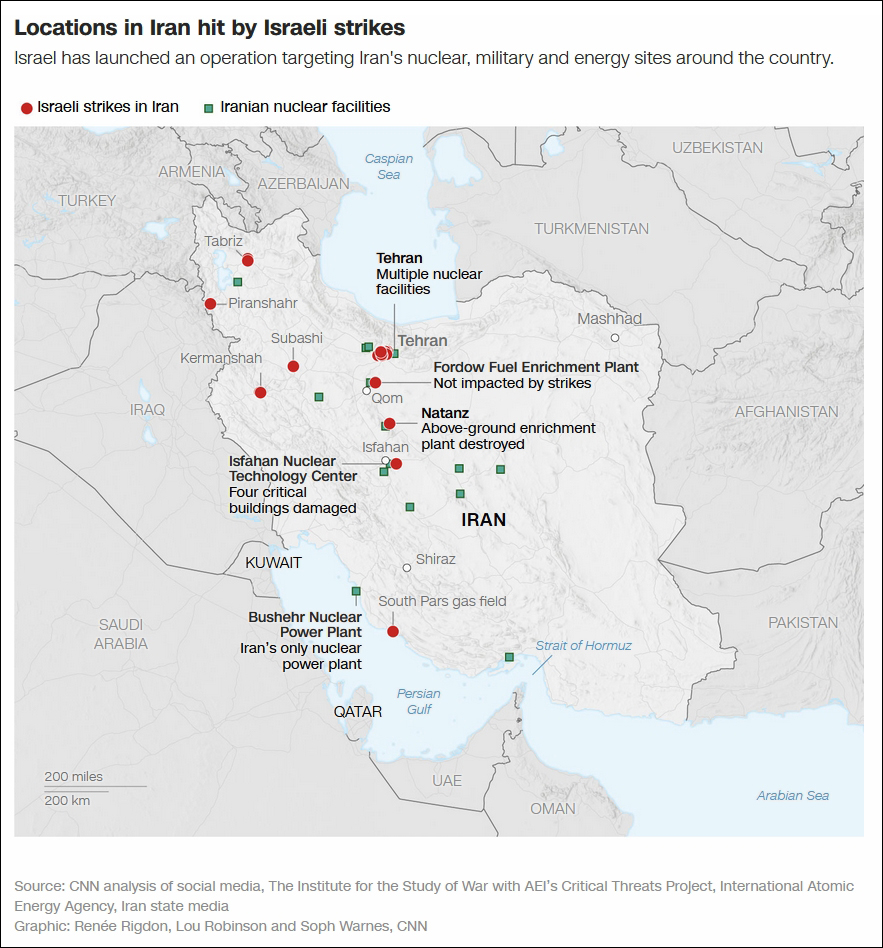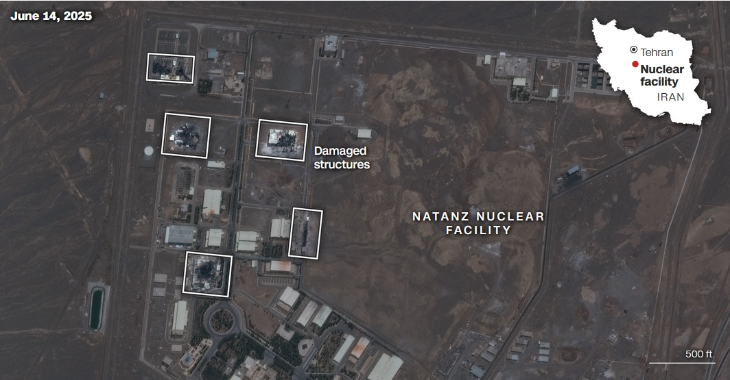 美國有線電視新聞網(CNN)15日報道,以色列此次空襲針對的是伊朗中北部三地——納坦茲(Natanz)、伊斯法罕(Isfahan)和福爾道(Fordow)的三個關鍵核設施。最新商業衞星圖像顯示,至少在納坦茲和伊斯法罕,攻擊似乎已對地面設施造成了“重大破壞”。