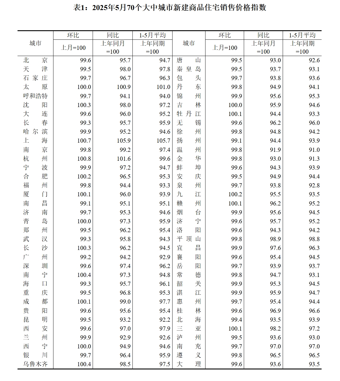 數據顯示,2025年5月份,70個大中城市中,各線城市商品住宅銷售價格環比下降,同比降幅繼續收窄。