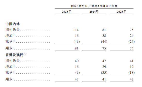 “但其他品牌基本不會賺錢,無論在台北、在香港,還是在上海的商場裏開專櫃都不會賺錢。”在小林看來,在高檔商場裏開店可以看作是一種品牌營銷,不過是成本非常高的那種。在穎通,75家在中國內地的自營門店中有49家是虧損的,香港澳門的42家門店中有33家的門店是虧損的(截至2025年3月31日)。同時在2023-2025年間,公司的門店開關很頻繁。