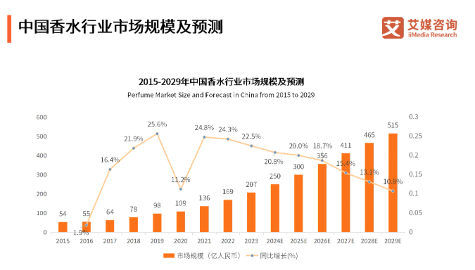 根據艾媒諮詢數據顯示,2023年中國香水市場規模達207億元,同比增長22.5%,預計2029年有望達到515億元。中國香水市場迅速發展,發展增速遠高於全球香水市場。艾媒諮詢分析師認為,中國香水市場相較於成熟的國際市場,仍處於藍海階段。