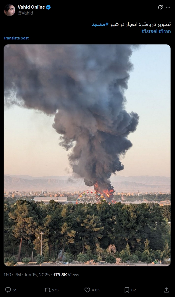 據伊朗法爾斯通訊社報道,當地時間15日傍晚,馬什哈德傳來兩聲爆炸。晚上6點30分左右,防空部隊在馬什哈德沙赫裏瓦爾街附近展開行動,爆炸聲響起後,濃煙沖天。另一方面,馬什哈德機場也發生了爆炸,引發火災。