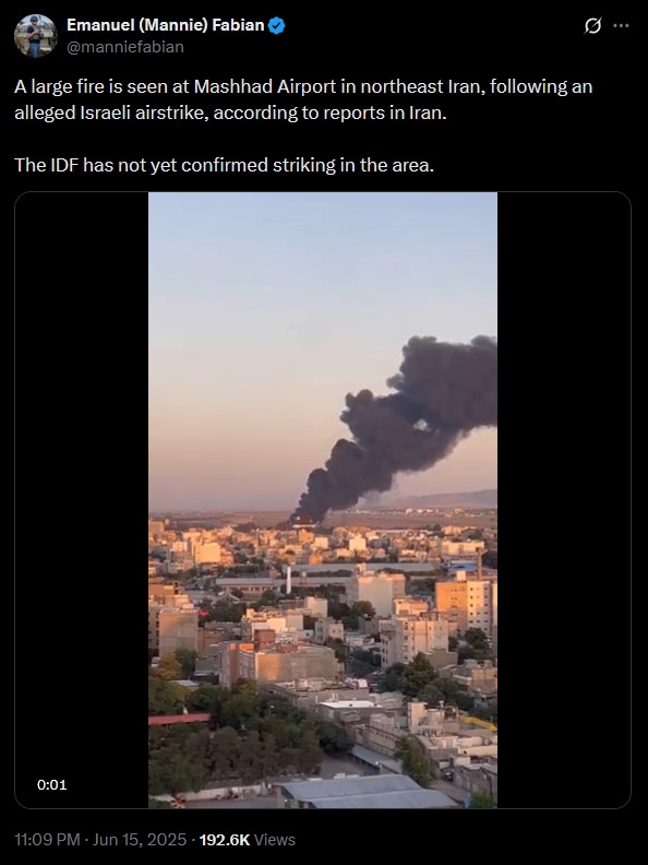 馬什哈德機場當地時間15日傍晚起火 《以色列時報》記者伊曼紐爾·法比安X帖文