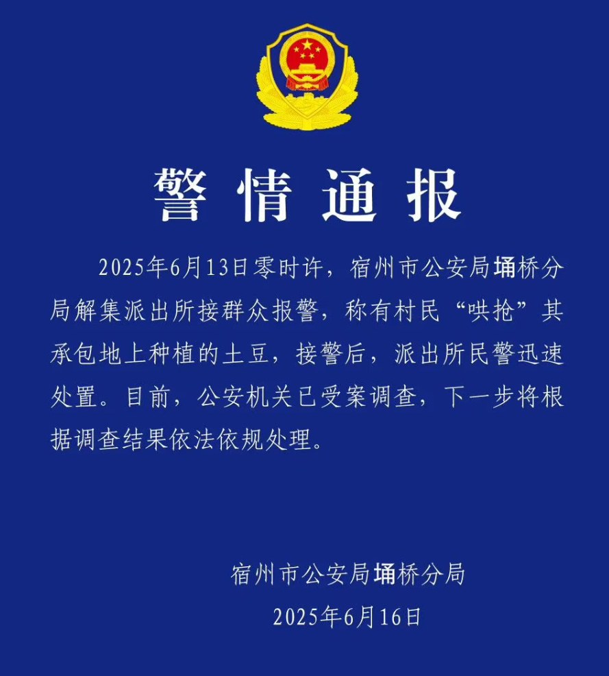 6月13日零時許,宿州市公安局埇橋分局解集派出所接羣眾報警,稱有村民“哄搶”其承包地上種植的土豆,接警後,派出所民警迅速處置。目前,公安機關已受案調查,下一步將根據調查結果依法依規處理。