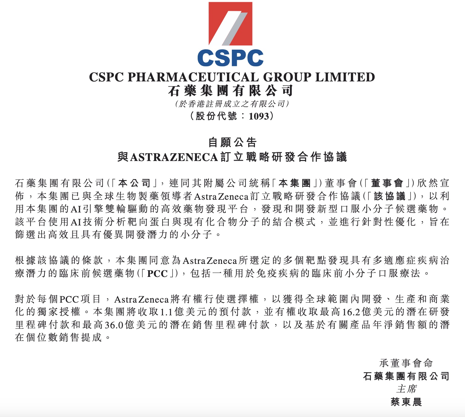 6月13日,跨國製藥巨頭阿斯利康與中國藥企石藥集團(01093.HK)宣佈達成戰略研發合作,聚焦AI驅動的新型口服小分子藥物開發,目標直指免疫疾病及多適應症慢性病領域。