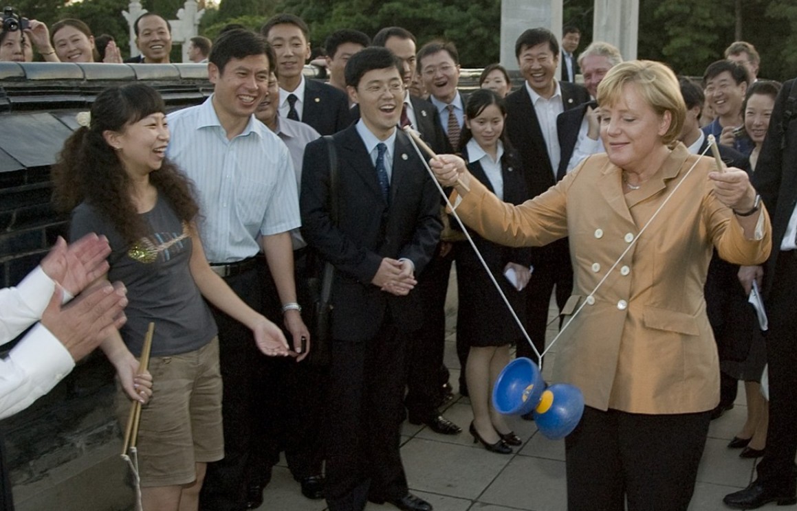 德國總理默克爾於2007年8月27日在北京中山公園玩中國空竹。CFP