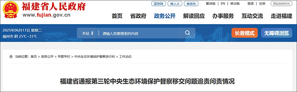 福建省政府網站6月16日通報第三輪中央生態環境保護督察移交問題追責問責情況。