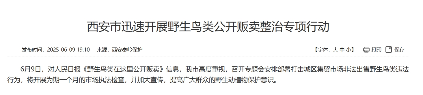 在此之前,《人民日報》於6月9日刊發樂《野生鳥類在這裏公開販賣》一文,披露了在陝西西安市鳥類交易市場有野生鳥類被公開販賣,其中甚至有一些屬於國家二級保護動物的問題。