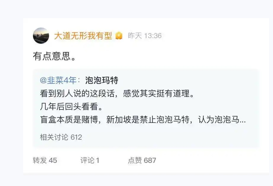 另有網友“韭菜4年”發文看衰泡泡瑪特。他援引一段觀點指出,盲盒本質是一種賭博行為,該用户還批評盲盒熱潮不過是一陣明星帶動的潮流風,缺乏長期價值與核心護城河,稱“產品毫無門檻,很容易被模仿”等。
