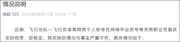 據澎湃新聞報道,此前,南航飛行總隊一飛行員李某用其個人賬號在網絡平台發佈有關其職業發展訴求的信息。