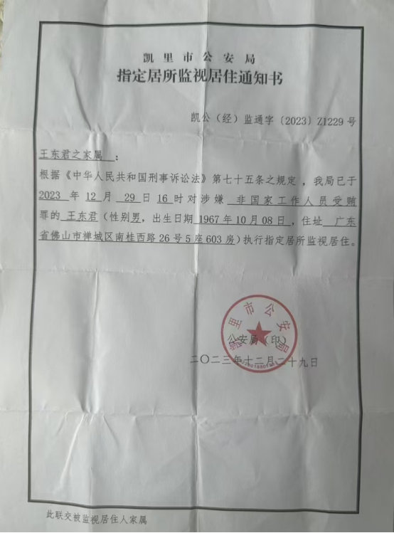 2023年12月29日,凱里市公安局以“非國家工作人員受賄罪”,對王東君指定居所監視居住。兩個月後,王東君的罪名更改為“利用影響力受賄罪”。