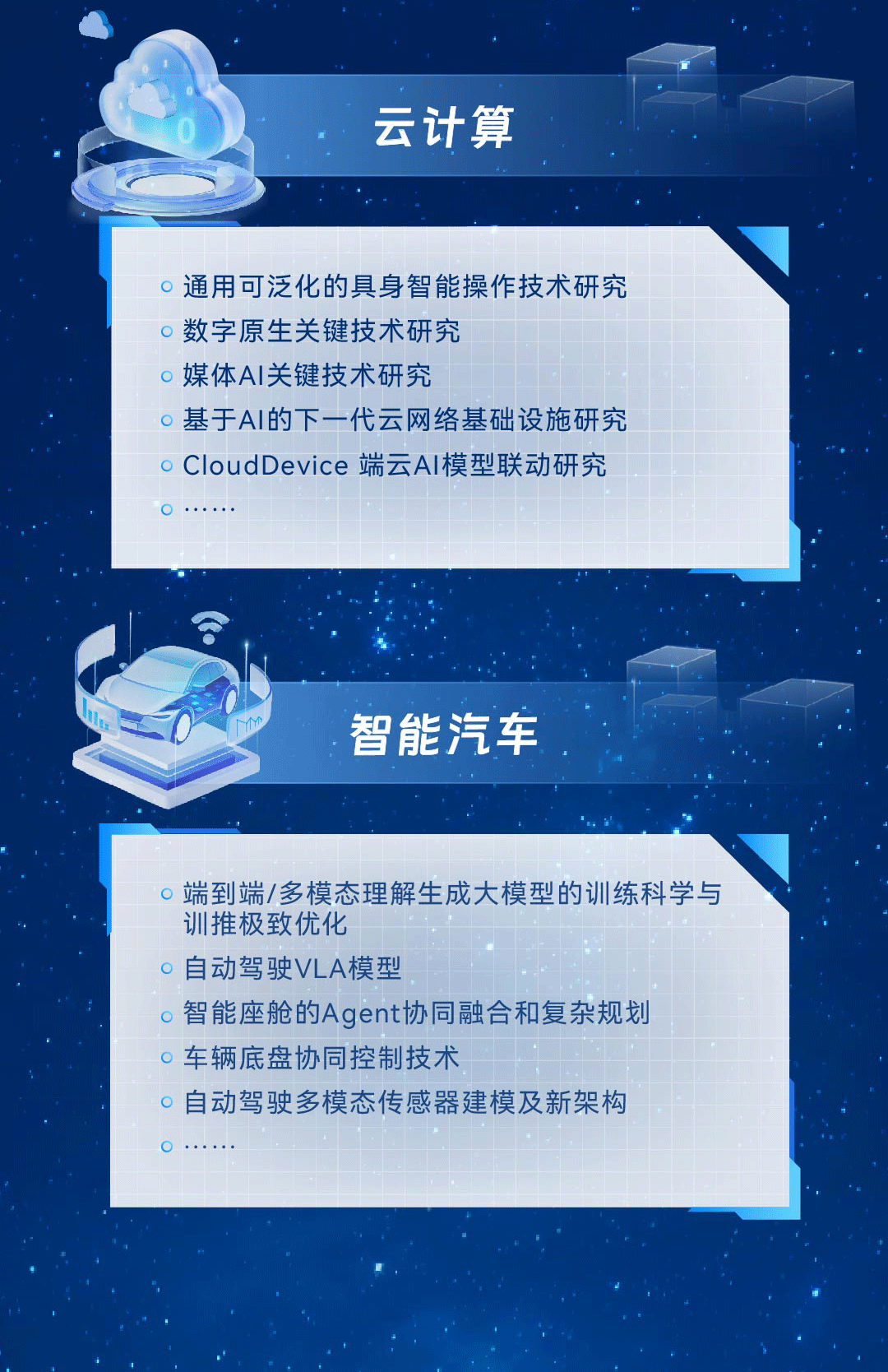智能終端領域的課題涉及世界模型(物理規律)理論突破,面向智能體和操作系統的個性化與記憶增強,基於計算機視覺、多模態理解和生成的多媒體算法研究、AI及智能系統關鍵技術研究、終端高效去敏寬帶功放架構和線性化研究等。