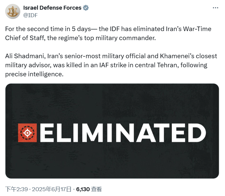6月17日,以色列軍方在社交媒體上發佈消息,稱其已經打死伊朗最高軍事指揮官阿里·沙德馬尼(Ali Shadmani)。